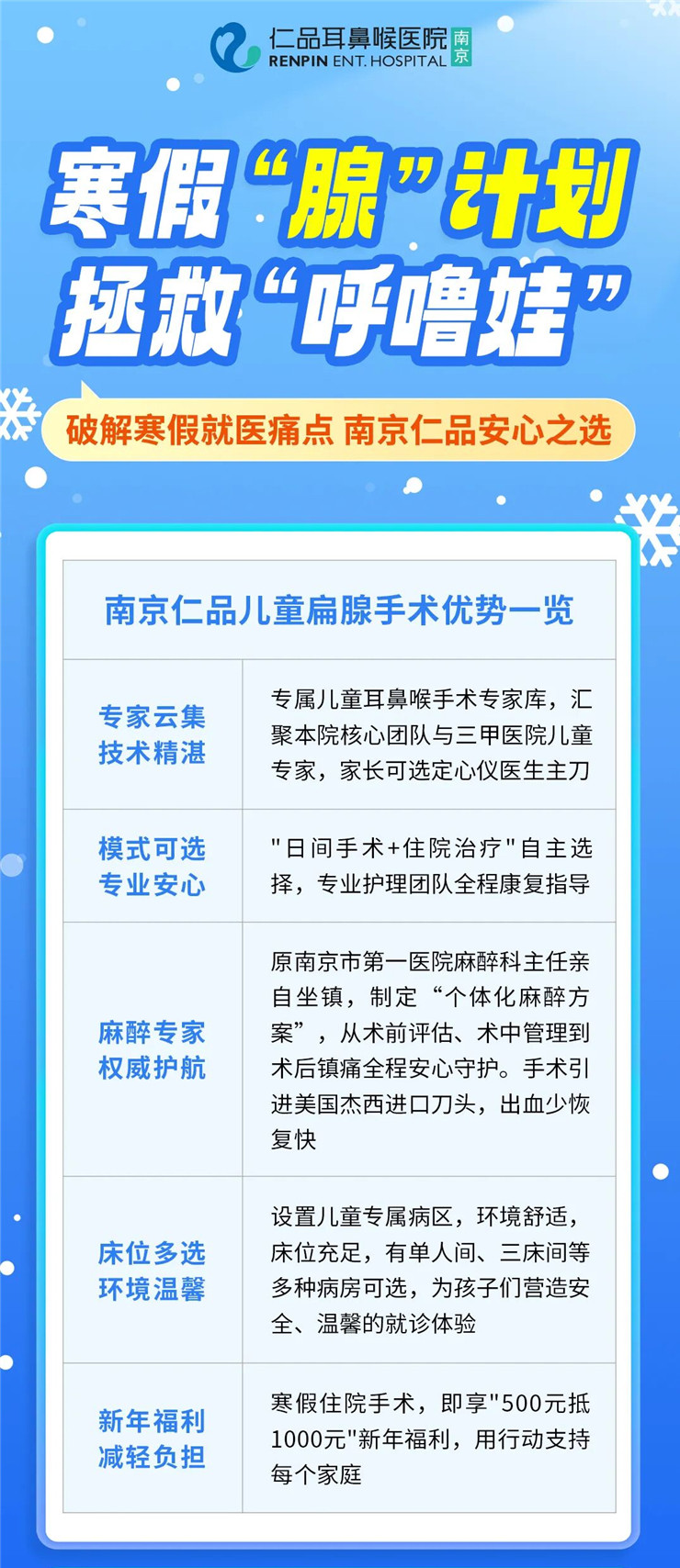 为了帮助孩子们利用假期窗口期及时解决扁腺问题,南京仁品耳鼻喉专科医院正式启动“寒假儿童扁腺手术绿色通道”专项服务。该通道旨在整合优质资源、优化诊疗流程,让治疗更高效、更便捷、更安心。
