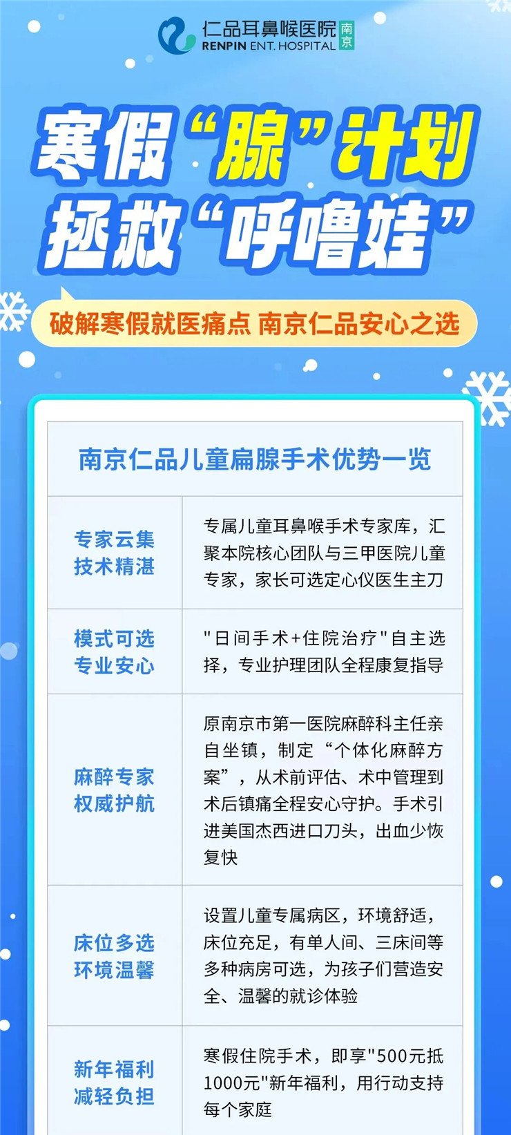 目前,寒假仅剩最后一周时间。专家建议,对于符合手术指征的孩子,家长应尽早安排治疗,切勿陷入“等待腺样体自然萎缩”的认知误区,也不要因为犹豫而错过寒假这个理想的恢复期,以免影响孩子新学期的学习状态。为满足节后集中就诊需求,南京仁品耳鼻喉专科医院特别开通了“寒假儿童扁腺手术绿色通道”。该通道优化了预约、检查、手术、康复全流程,实现快速就诊、快速评估、快速手术。更为关键的是,医院集结多位三甲医院儿童耳鼻喉专家以及本院核心诊疗团队,组建“儿童耳鼻喉手术专家库”,家长可在其中选择自己心仪的三甲医院儿童专家主刀,并配有专业的麻醉专家团队全程护航,最大程度保障手术的稳定性与精准度。