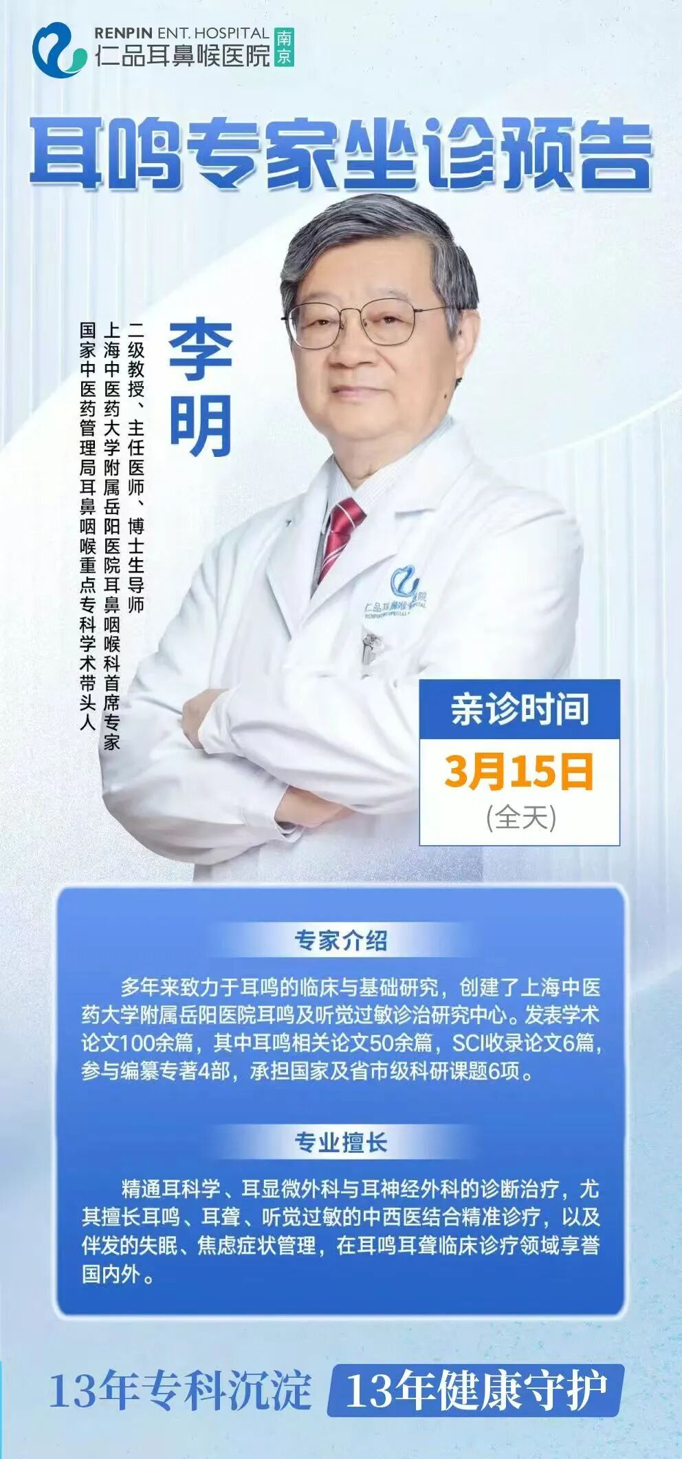 “耳鸣反反复复,到底能不能治?”如果你也正被耳鸣困扰,这份专属福利请务必收好——3月15日,耳鸣专家、国家中医药管理局耳鼻咽喉重点专科学术带头人李明教授,将亲临南京仁品耳鼻喉医院坐诊,面对面为你破解耳鸣难题,给你一次重获安宁的机会!