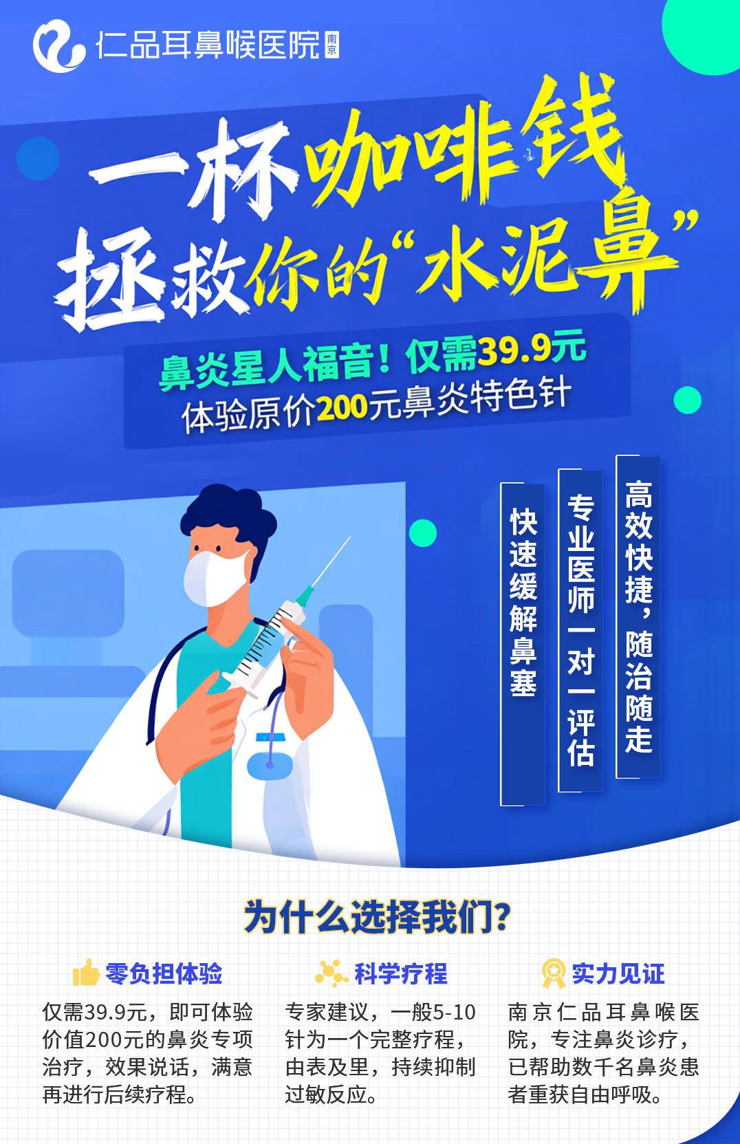 春季一到,随着花粉、柳絮等过敏原逐渐进入活跃期,过敏性鼻炎进入高发季。为帮助广大市民有效缓解这一季节性健康困扰,南京仁品耳鼻喉专科医院即日起推出“鼻炎针”低价体验公益活动,原价200元的鼻炎针,现在仅需39.9元即可体验一次,让更多患者能够以亲民的价格体验精准治疗。