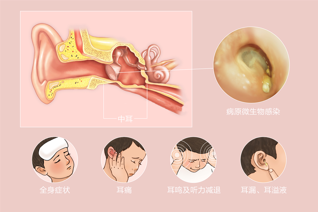 化脓性中耳炎是中耳黏膜的化脓性炎症,临床主要分为急性化脓性中耳炎与慢性化脓性中耳炎两类,核心症状均围绕耳部不适展开,具体表现为: